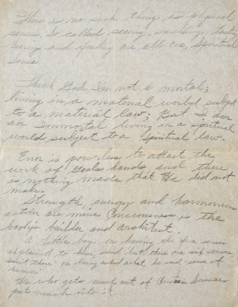 There is no such thing as physical senses. So called seeing, smelling, tasting, hearing, and feeling, are all me, Spiritual Sense. Thank God I am not a mortal; living in a material world, subject to a material law; but I am an immortal living in a spiritual world subject to a spiritual law. Error is powerless to attract the work of God’s hands and there is nothing made that He did not make. Strength, energy, and harmonious action are mine. Consciousness is the body’s builder and architect. A little boy, having the five senses explained to him, said, “but there are six senses aren’t there,” on being asked what, he said “sense of humor.” He who gets much out of Christian Science puts much into it.